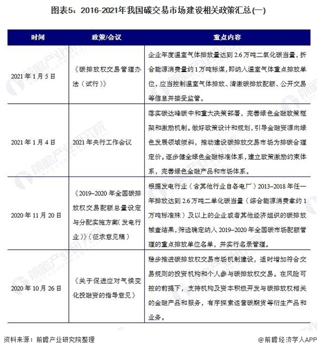 碳排放權(quán)交易體系是實現(xiàn)低成本碳減排的關(guān)鍵。2016-2021年是我國碳交易市場的黃金時期,我國出臺了一系列政策建立包括建立相關(guān)綠色金融、碳中和等來推動碳交易市場發(fā)展,具體政策匯總?cè)缦拢?/div>