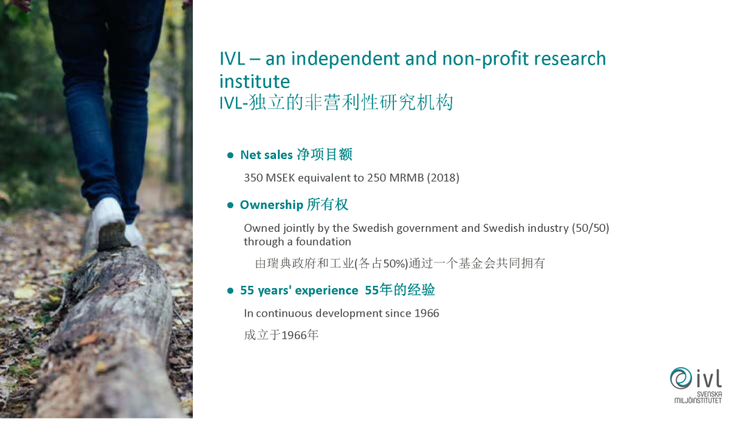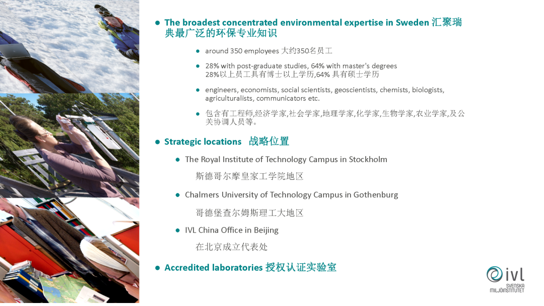 先簡(jiǎn)單介紹一下我們的機(jī)構(gòu),我們的機(jī)構(gòu)是由瑞典的政府和工業(yè)各占50%成立的一個(gè)非盈利性的應(yīng)用性的研究機(jī)構(gòu),成立于1966年,到目前有五十多年的歷史。我們的總部是在瑞典的首都斯德哥爾摩,在其他的國(guó)家,在中國(guó)和印度都有代表處,目前我們有350名的員工。包括環(huán)境工程師、經(jīng)濟(jì)學(xué)家、社會(huì)學(xué)家等等各方面一些跨學(xué)科的專家,在瑞典我們有自己的實(shí)驗(yàn)室,除了科研以外也做一些技術(shù)開發(fā)、技術(shù)轉(zhuǎn)移等工作。