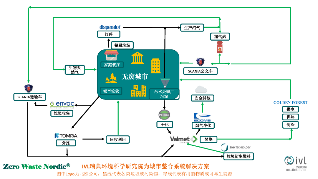 這是我們初步的聯(lián)盟的解決方案,目前我們所含的無(wú)廢城市的解決方案包括餐廳的餐廚垃圾,餐廚垃圾我們有一間公司可以做很智能化的破碎和收集,收集起來(lái)不是像過(guò)去國(guó)內(nèi)在提的有爭(zhēng)議的,進(jìn)入到下水道,我們彌補(bǔ)的經(jīng)過(guò)一個(gè)容器把它收集起來(lái),把它做沼氣。沼氣提純以后,可以用到這家公司的公交車?yán)?,也是很知名的一家北歐的供應(yīng)商。提純以后,可以作為可再生的天然氣回到城市里進(jìn)行回收和使用。同時(shí)可以用在環(huán)衛(wèi)的垃圾運(yùn)輸車?yán)?,開始常老師講到環(huán)衛(wèi)車怎么更加清潔,這也是一個(gè)比較好的做法。普通的生活垃圾,這里面有一家瑞典公司是做智能化收集的,是把垃圾像收污水一樣收垃圾,垃圾不是投到垃圾桶,而是直接掉到地下的管廊里,它有高速的風(fēng),可以快速的把它運(yùn)輸?shù)嚼修D(zhuǎn)站,在地上看不到垃圾和垃圾桶?;厥找院?,這家公司可以做一個(gè)很智能化的分揀,它是全球很知名的一家做自動(dòng)化分選的公司??梢园押苡袃r(jià)值的東西回收回來(lái),沒(méi)有價(jià)值的東西進(jìn)一步去做能源回收。能源回收這一塊,這里有一家芬蘭公司是做垃圾焚燒做得比較好的,叫韋美德(音),焚燒以后,它的煙氣做到凈化,有一家公司是做煙氣凈化的。焚燒所產(chǎn)生的熱量由這家公司去設(shè)計(jì),給城市供熱供冷、供電。還有一家芬蘭公司做垃圾衍生原料,垃圾處理以后,讓垃圾焚燒會(huì)更加便利。