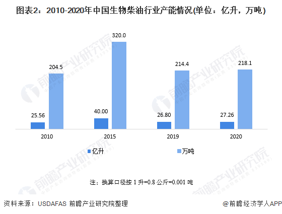 2019年,我國生物柴油產能為26.8億升,約為214.4萬噸;2020年,由于歐盟的需求推動,國內產能有所增加,約為218.1萬噸。