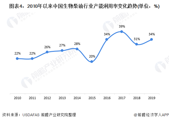 在行業(yè)產能利用現(xiàn)狀方面,根據(jù)美國農業(yè)部對外農業(yè)服務局(USDAFAS)的統(tǒng)計數(shù)據(jù)顯示,2010-2019年,中國生物柴油行業(yè)的產能利用率總體提升;在“十三五”規(guī)劃的推動下,2019年,中國生物柴油行業(yè)產能利用率約為34%。