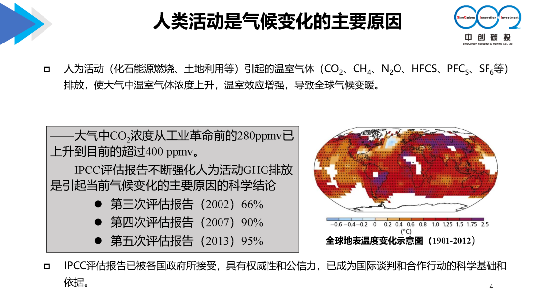 從一開始的66%到90%到95%,95%大家如果是做科學(xué)或者做科研,或者做工程的知道,基本上可以代表一定是這樣的。氣候變化在全社會(huì)絕大多數(shù)人眼里已經(jīng)基本上認(rèn)為它是人為造成的。而且引起氣候變化主要的原因是溫室氣體,溫室氣體有六大類,其中最主要的就是二氧化碳。二氧化碳占了我們溫室氣體排放的80%以上,所以我們經(jīng)常為什么說碳排放,應(yīng)該是溫室氣體減排,但是因?yàn)樘际亲钪饕?,所以我們一般都簡稱碳排放。
