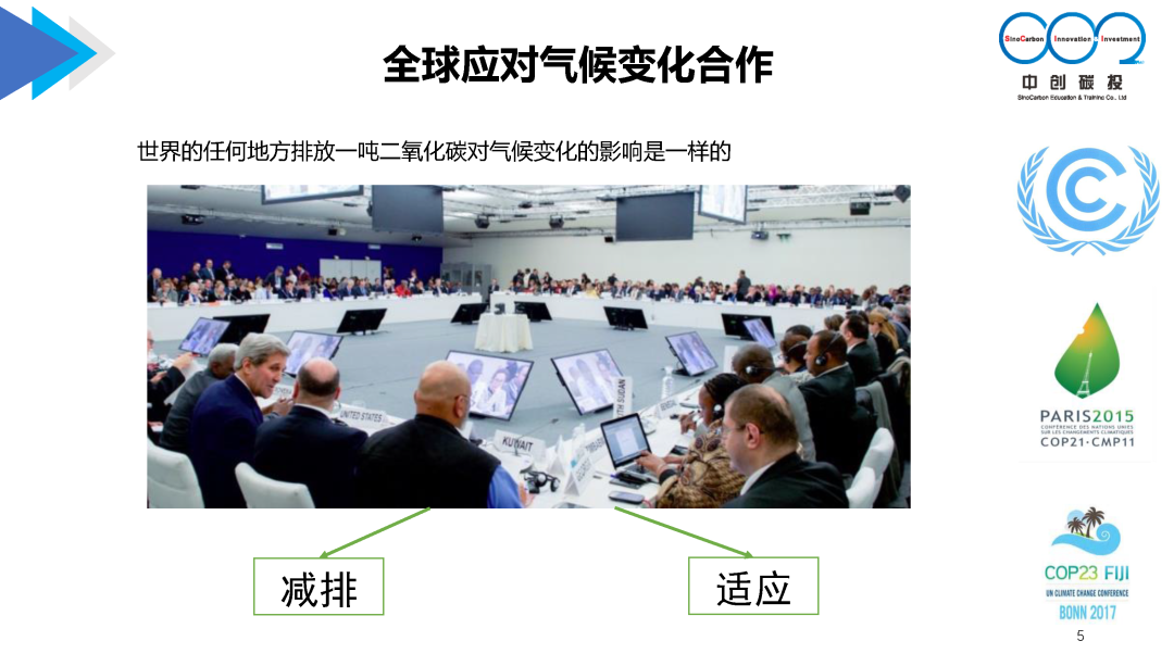 我們污染物比如說中國的污染物,華北最多能飄到韓國、日本到頭了,對美國的影響幾乎是微乎其微的。但是溫室氣體對全球的影響是一樣的,你在哪排都一樣。所以它有一個(gè)很好的基礎(chǔ),全球需要共同的來應(yīng)對這個(gè)問題。應(yīng)對氣候變化從一開始就是一個(gè)國際合作的問題,從我們1997年聯(lián)合國氣候變化框架公約開始,到后來大家都知道2005年京都議定書生效,到2009年有哥本哈根會(huì)議,有2015年有巴黎協(xié)定,我們每年氣候變化這件事情在聯(lián)合國都要開氣候峰會(huì)。