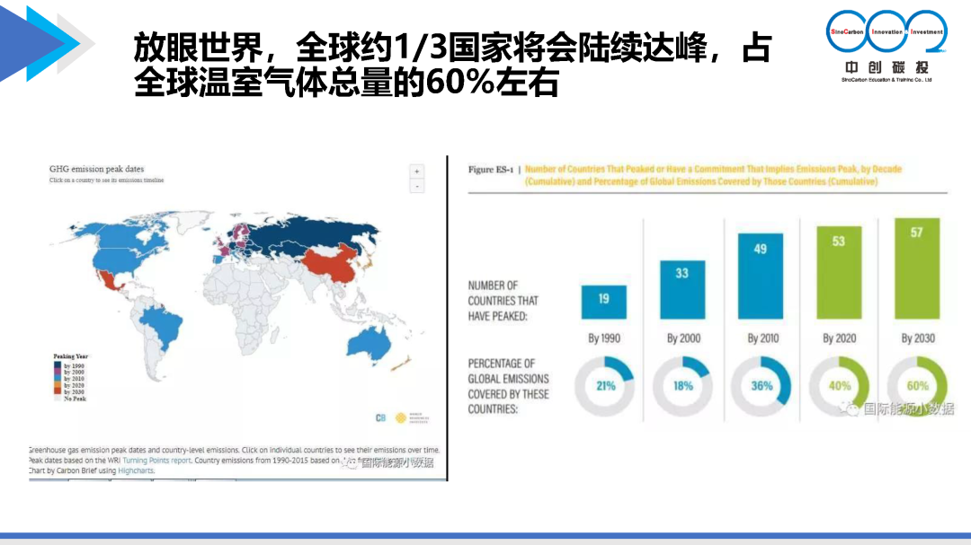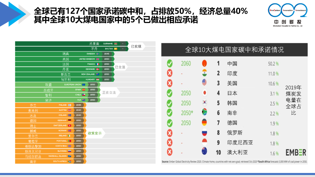 全球現(xiàn)在已經(jīng)有三分之一的國家已經(jīng)達(dá)到或者在2030年前陸續(xù)達(dá)到碳排放的峰值,我們國家承諾在2030年以前達(dá)峰。達(dá)峰的國家占全球溫室氣體排放的60%左右。碳中和更難一些,主要的國家還沒有達(dá)到碳中和,只有非常小的國家碳中和了,大部分國家都是在2030年以后,2040年、50年以后,這些國家承諾達(dá)到碳中和。包括十個(gè)全球最大的煤電國家,其中有五個(gè)作出了承諾,在未來2050年或者2060年達(dá)到碳中和。
