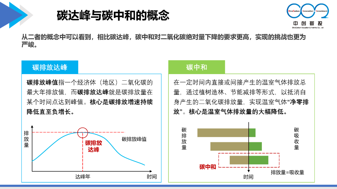 對碳中和和碳達(dá)峰,并不是說碳中和就不排放了,碳中和和指的是它的排放和吸收的二氧化碳是同樣的,在同一時(shí)間之內(nèi)是同樣的,這樣我們認(rèn)為它是碳中和或者近零碳排放。達(dá)峰比較早一些,碳排放的地區(qū)達(dá)到最大值,之后要往下減。