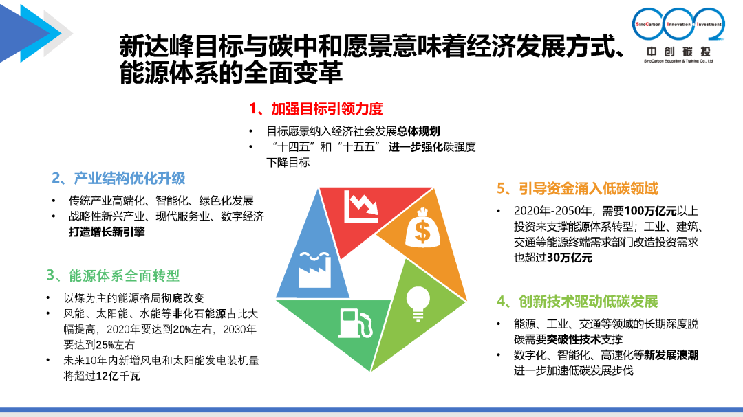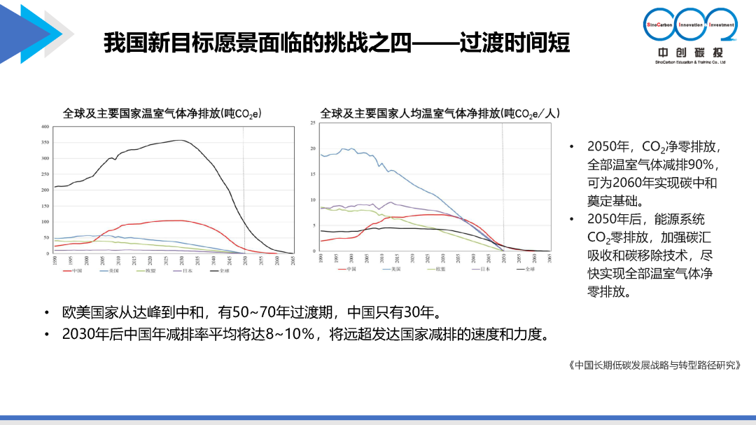 另外現(xiàn)在大家都知道3060目標(biāo),雙碳目標(biāo),是一個(gè)絕對目標(biāo),是一個(gè)絕對的指標(biāo)。我們國家面對碳中和是非常困難的,它的過渡時(shí)間比發(fā)達(dá)國家平均60年的過渡期減少了一半,我們中國只有30年,它的難度遠(yuǎn)超發(fā)達(dá)國家。達(dá)峰和中和會(huì)有很多方案,意味著我們整個(gè)經(jīng)濟(jì)發(fā)展方式,包括能源體系全面變革。這里頭會(huì)有產(chǎn)業(yè)結(jié)構(gòu)升級,包括能源的轉(zhuǎn)型,包括我們引導(dǎo)資金,包括我們的創(chuàng)新的低碳技術(shù),都要做很多努力。