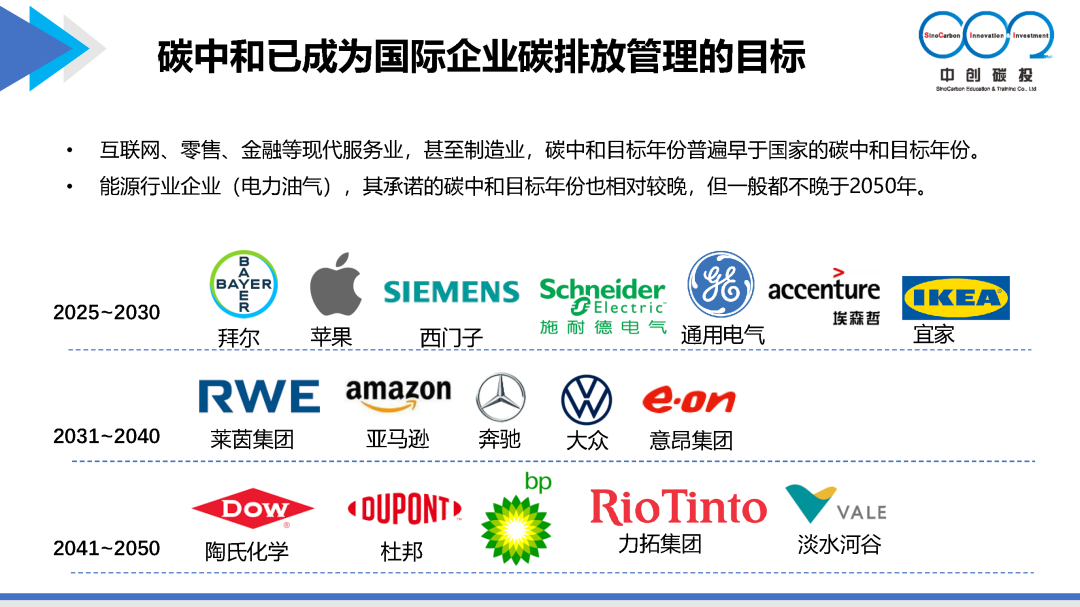 除了國家,很多企業(yè)也開始承諾碳中和,達(dá)到碳中和的難易程度不同。輕工業(yè)、制造業(yè)或者服務(wù)業(yè),可以在2030年以前達(dá)到碳中和。但是比如對一些稍微大一些的偏重工業(yè)的,他們會(huì)比較晚,比如像石油行業(yè)、煤電行業(yè)他們可能40年、50年才能達(dá)到碳中和。