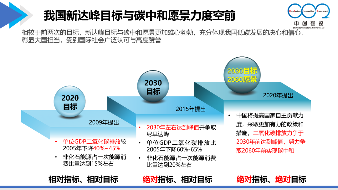 對于我們國家來說,我們國家2009年開始就提出相應(yīng)的減排目標(biāo)了,2009年提出2020年的目標(biāo)比05年碳排放的強(qiáng)度要下降40-45%,非化石能源的比重在15%左右,是一個(gè)相對的指標(biāo)。