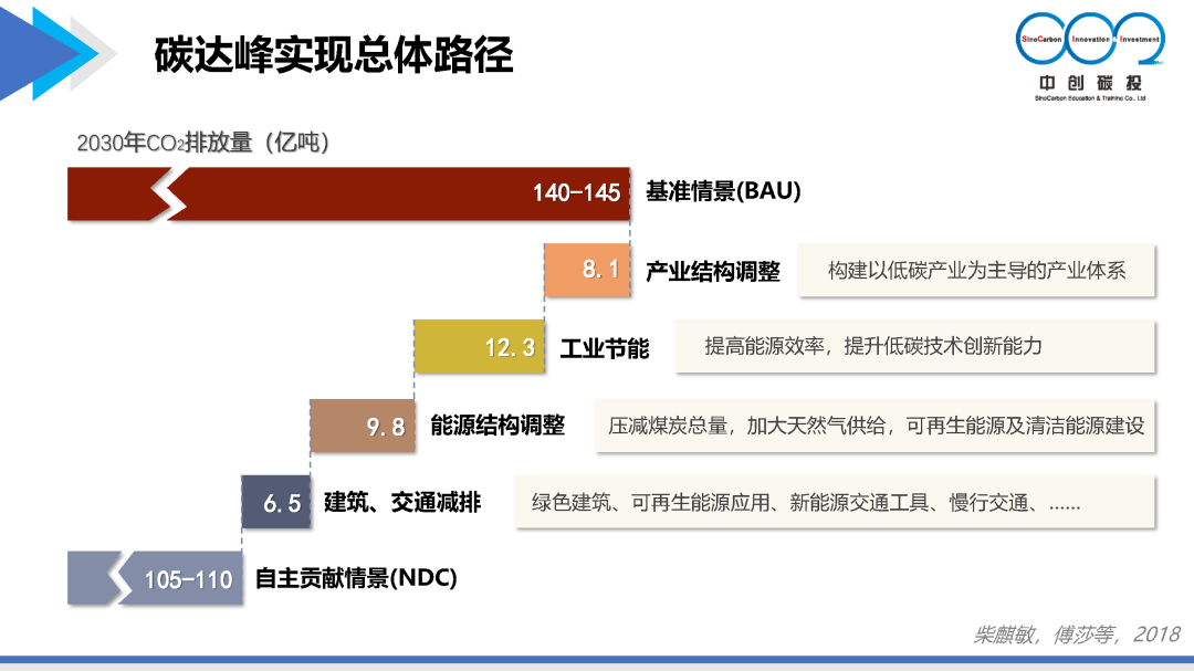 這是氣候變化中心當(dāng)時(shí)做的一個(gè)測算,對這幾個(gè)產(chǎn)業(yè)結(jié)構(gòu)調(diào)整,包括工業(yè)節(jié)能,包括建筑交通的減排,可以看到他們對達(dá)峰的貢獻(xiàn)都是有多有少,產(chǎn)業(yè)結(jié)構(gòu)調(diào)整和工業(yè)節(jié)能是最主要的部分。