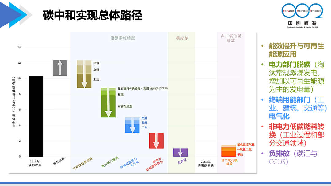 對于中和來說就不一樣了,除了剛才提到的這些以外,我們建筑和交通就會(huì)占到比較大的比重。我們城市環(huán)衛(wèi)跟我們的建筑交通會(huì)有很多關(guān)系,包括工業(yè)也有關(guān)系。除了這些以外,還需要做到的就是一些負(fù)排放的技術(shù),我們要把碳排放從大氣中吸收下來,才能達(dá)到中和,所以多了一個(gè)負(fù)排放的技術(shù)。
