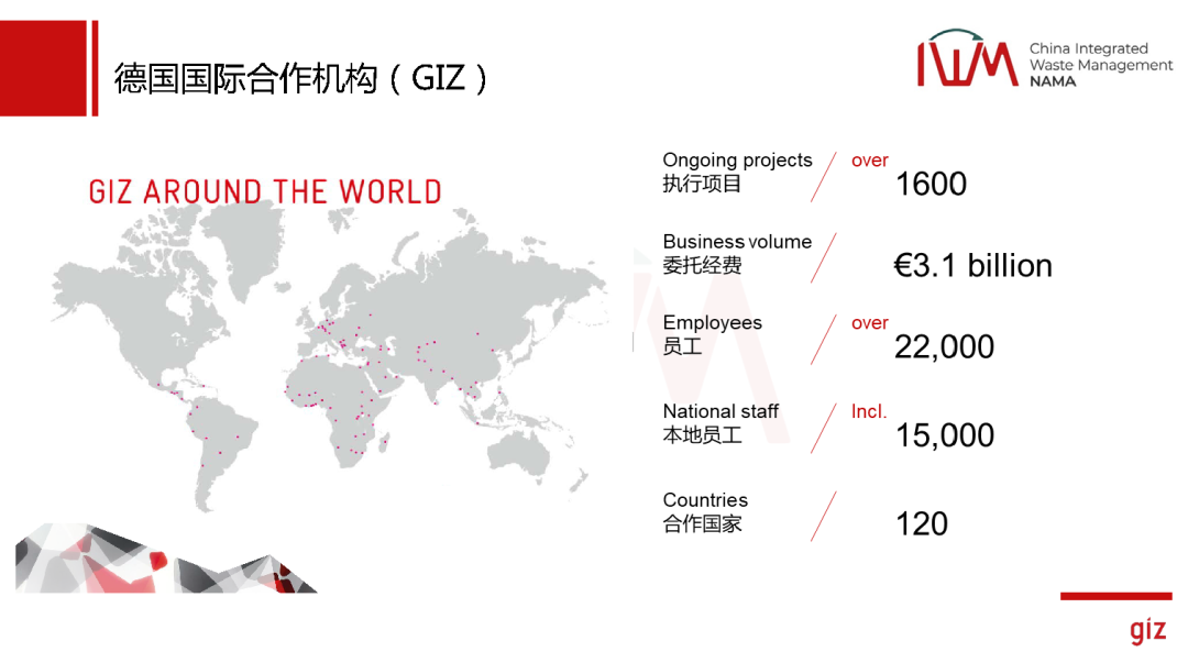 首先介紹一下德國國際合作機構,它其實算是德國的國企,唯一的股東是德國的經(jīng)合部,但是它是一個非盈利的企業(yè),我們所有的經(jīng)費都來自于德國的政府以及歐洲的政府基金會。我們在全球有120多個辦事處,有兩萬多個員工,1980年進入中國,目前有40多年的時間了。在中國有160個人,有100多位是中國同事,有60位是外國同事。