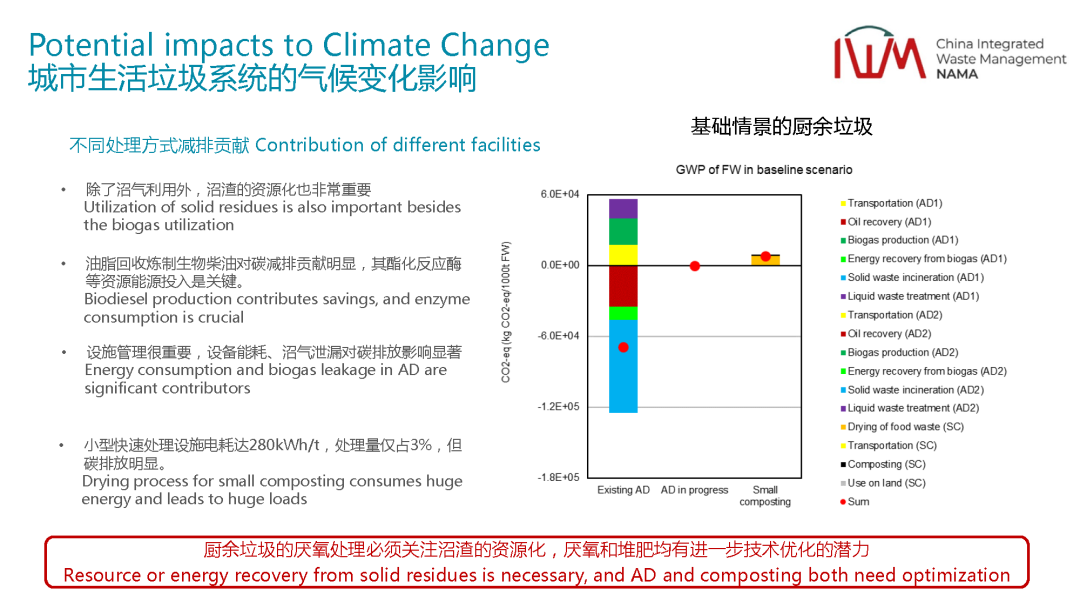 除了這個之外,我們也對不同的技術它的排放強度做了一個分析。比如剛剛說了,未來垃圾分類要開始了,有些垃圾都要被分出來了,都要處理,不同的處理技術它的減排貢獻是什么樣的,不同的技術處理有不同的技術路線,我們會分析堆肥,厭氧技術,我們可以看到這個就是用了經(jīng)典的全生命周期的分析方法,我們委托丹麥科技大學,是丹麥科技大學他們自行研發(fā)的一個分析工具,這個在垃圾領域是非常有名的,也得到了全球的認可。在這個里面我們會去分析它不同的處理環(huán)節(jié)對減排的貢獻,可以看到有機垃圾絕對是非常減排的,但是減排的前提是在于我除了要把沼氣用好之外,沼渣的資源化也非常重要。如果我的有機垃圾處理完了之后,沼渣要么實現(xiàn)土地利用,替代一部分的有機肥,或者回到土地去做碳匯,哪怕從純減排的角度,重新回到焚燒廠焚燒,實現(xiàn)資源的回收,這兩部分都可以貢獻比較明顯的減排量。但是沼渣處理之后回到填埋場,從整個流程來講,減排的效益沒有那么明顯,可能會導致一部分負面的影響。同時油脂的回收,去做生物柴油,這個對減排的貢獻是非常明顯的。