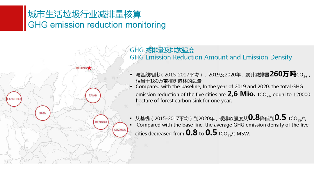 這里面也得到了試點城市特別主動的支持,在西安他們新建的焚燒廠配備了設備,這給我們國家的焚燒企業(yè)將來在這個行業(yè)里面他們的氧化亞氮的排放情況怎么樣,能夠提供第一手的數(shù)據(jù)。在這個基礎模型的處置上,我們有了幾個基線選擇,選擇了2015到17年三年的平均值,作為我們整個項目的基線。在這之后,2019年和2020年我們兩年分別去這五個城市做了監(jiān)測,可以看出有一些初步的結(jié)論。第一關于減排量和排放強度,這兩年從19年和20年,與基線相比,五個城市累計實現(xiàn)減排量260萬噸二氧化碳當量,這個相當于是180萬畝植樹造林,一年的碳匯地量,也是非常可觀的數(shù)據(jù)。除了排放總量,會有一個特別好的數(shù)值就是排放強度,垃圾管理行業(yè)排放強度是多少,從基線值到2020年,我們五個城市平均碳排放強度從0.8噸二氧化碳當量每噸垃圾降到了0.5,能夠看出中國垃圾行業(yè)以五個試點城市為例,已經(jīng)實現(xiàn)向低碳化發(fā)展的轉(zhuǎn)型。碳排放強度的降低已經(jīng)達到了40%以上,能夠看到我們行業(yè)是在更清潔、更低碳,這個是一個特別有意義的數(shù)據(jù)。我們也分享給我們總部以及國際同事,他們非常認可,能夠看到中國垃圾行業(yè)在向低碳方面轉(zhuǎn)型升級。