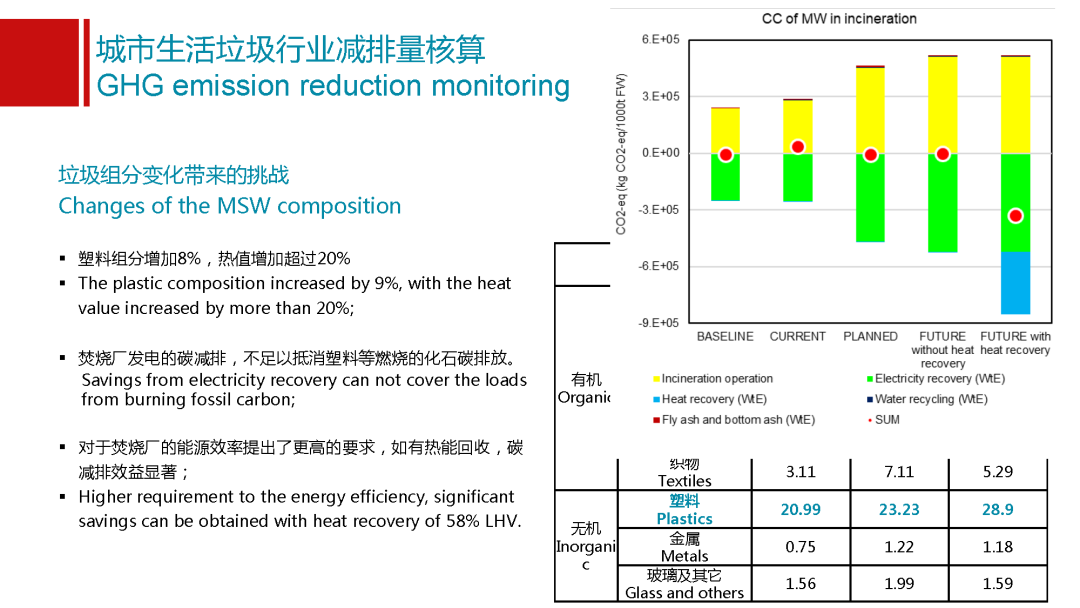 這是以蘇州為例,蘇州做的特別好,他們每年有定期大量的數(shù)據(jù)監(jiān)測,能夠證實我這個數(shù)據(jù)的科學性和可靠性??梢钥吹教K州從17年到19年它的塑料含量增加了8%,這個可能有比較多的原因。比如生活方式的改變,是不是用了更多的快遞,經(jīng)濟水平是不是更發(fā)達了,以及是不是有可能整個垃圾收運管理體系以及環(huán)保要求更高,讓更多的品類進入到我的垃圾體系里面來。但是我必須要看到整個垃圾處理,什么東西進到焚燒廠,這個是有變化的。組分雖然增加了8%,但是對熱值貢獻是20%,如果焚燒廠不作出相應的響應,不提高能效,之后產(chǎn)生的減排效益不足以抵消新增的塑料產(chǎn)生的排放,焚燒廠需要進一步的優(yōu)化。對焚燒廠的能源效率提出更高的要求,我們初步核算一下,如果一個焚燒廠在目前我們的垃圾組分的情況下,我們現(xiàn)在五個城市的焚燒廠基本上都能夠?qū)崿F(xiàn)噸垃圾發(fā)電量400度左右,這個已經(jīng)很高了,他們的熱效率是在28%,還能夠維持比較好的狀態(tài)。但是如果我們將來熱值或者我的組分還會進一步變化,因為垃圾分類做的越來越好,肯定熱值會越來越高。我的焚燒廠的能效就要進一步提高,否則可能會從一個有很好的減排效益的設施變化成碳排放強度可能是最高的,這個很重要。對焚燒廠來講,如果他能夠?qū)崿F(xiàn)熱能回收,就像我們上面那個圖,會給出一些建議。提高發(fā)電效率很重要,但是電和熱的回收能夠?qū)崿F(xiàn)更高的能效的利用,可能就會有更好的減排效益,這也是在焚燒企業(yè)將來去做發(fā)展戰(zhàn)略的時候需要重點考慮的一個問題。