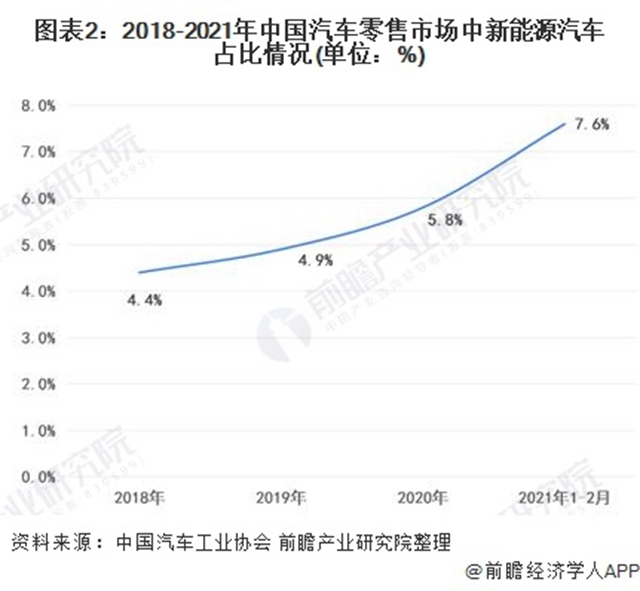 從國(guó)內(nèi)汽車(chē)零售市場(chǎng)中新能源汽車(chē)占比來(lái)看,2018-2021年新能源零售市場(chǎng)份額逐年增長(zhǎng),從2018年的4.4%增長(zhǎng)到2021年1-2月的7.6%。