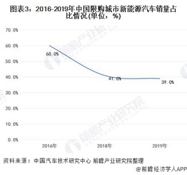 從近幾年新能源在限購(gòu)城市銷(xiāo)量占比趨勢(shì)來(lái)看,2016年限購(gòu)省市銷(xiāo)量占比為60%;2019年限購(gòu)省市新能源汽車(chē)銷(xiāo)量占比約39%,較2018年下降2個(gè)百分點(diǎn),反映出國(guó)內(nèi)新能源汽車(chē)消費(fèi)市場(chǎng)逐步下沉,限購(gòu)省市銷(xiāo)量持續(xù)占比逐步下降。