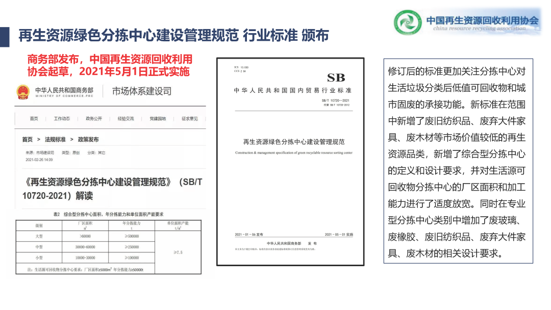我們特意強調(diào)了一下,修了三年,這個標準今年終于發(fā)布了。一出來社會反響特別大,關(guān)注分揀中心的合規(guī)性,一定要讓規(guī)范的企業(yè)沖到市場主體,去承擔相應的體系建設的任務,所以酒吧相應的標準強調(diào)了,也增加了生活源分類后回收物去承接的功能。就是把再生資源分揀中心完全打造成服務于城市固廢服務一個重要的節(jié)點,這是一個很重要的標準,也是我們做了三年的一個結(jié)果。