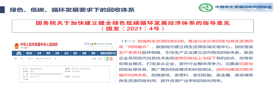 剩下幾個,一個就是生產(chǎn)者責任延伸,一個就是家電,還有回收的模式,線上線下結(jié)合,包括加強循環(huán)利用,我讀了十一條之后,都點到了,我個人理解它是從體系建設來抓,每句話說的都是怎么樣健全完善資源回收的體系,從體系的角度去講的,而不是前幾年打造基地,打造園區(qū),打造回收站點,現(xiàn)在是說從體系建設上來提高它的資源回收利用率。