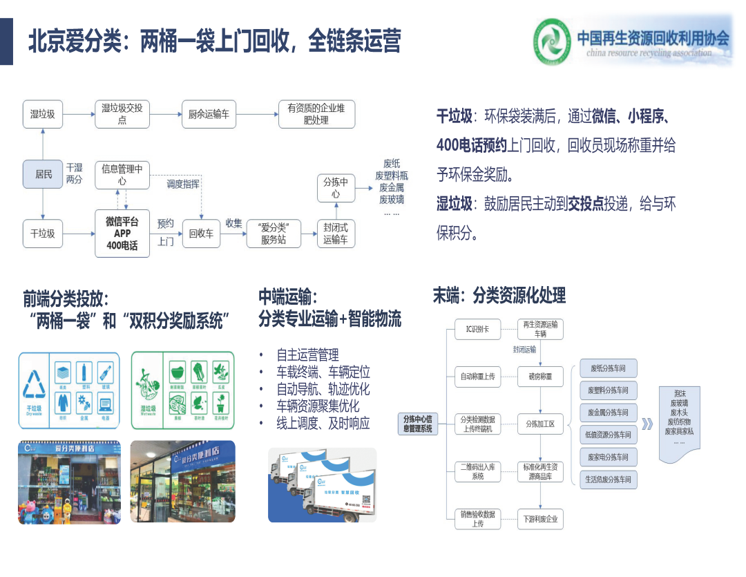 還有就是我們熟悉的愛分類,愛分類也是兩棲類企業(yè)了,現(xiàn)在在環(huán)衛(wèi)里面也是做的非常優(yōu)秀,非常好。這是我們供銷社系統(tǒng)內(nèi)部的企業(yè),我們協(xié)會是供銷社直屬的一級協(xié)會,我們下面所有的各區(qū)供銷社的企業(yè)都在做低值可回收物回收的事情。浙江環(huán)強這家企業(yè)是在三四年前在區(qū)里面做全產(chǎn)業(yè)鏈的運營,運營的非常好,政府也是根據(jù)減量化來給他補貼。