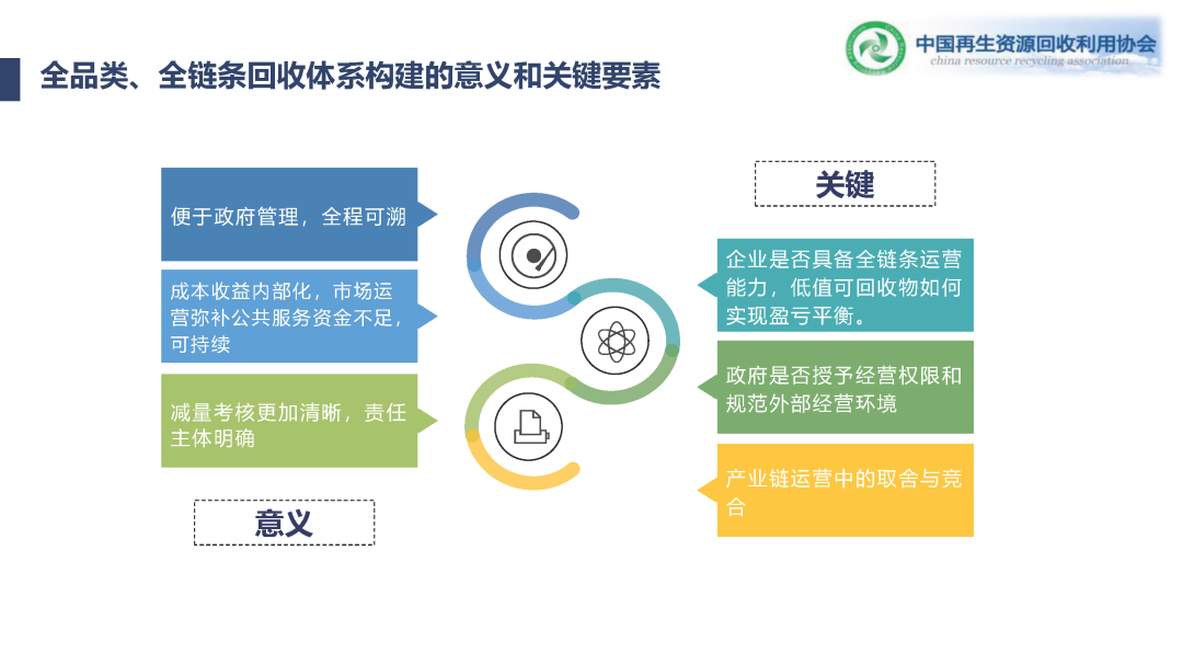 意義說過了,不再說了。關(guān)鍵是什么?首先是否企業(yè)具備再生資源運營的能力,這是很重要的。不是都給到你了,他能把再生資源的價值最大化,可能他實現(xiàn)不了盈虧平衡政府要看他是否具備這種能力。第二是政府這方面,你是否授予了特許經(jīng)營的權(quán)限,如果他不是一個區(qū)域拿到一定規(guī)模的經(jīng)營權(quán)的話,他是很難盈虧平衡的。還有就是你是否給他規(guī)范了外部的經(jīng)營環(huán)境,如果不做到這一點,政府就要一直補這個企業(yè)。因為外地一直有游商存在,他根本就拿不到價值高的資源。第三從企業(yè)層面自身去考慮的,產(chǎn)業(yè)鏈中很多地方不應該自己直接經(jīng)營的,要比較一下成本收益,有時候就要合作,怎么把現(xiàn)有的社會上的游商去整編它,怎么和各個品類的運營商去搭平臺,一家企業(yè)做不了全鏈條所有的事情,要進行整合。我們今天也在說虎哥這個事,政府出錢,政府什么事該出錢,什么事不該出錢,其實是特別基礎的一個課題研究。再生資源從五幾年開始,政府說全國要大力倡導回收,已經(jīng)存在的一個行業(yè),突然之間大家覺得要錢補才能干,政府過不來這個勁。我們要把它掰清楚,你讓我干的哪些事情是我原來本行業(yè)能干的,哪些事情是你附加給我的公共服務的職能,這是要厘清的。