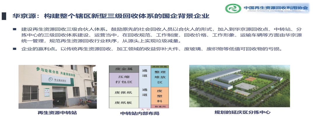 在北京有兩家企業(yè)很有名,就是行業(yè)內(nèi)的,現(xiàn)在在做整個體系的,一個是華京源,也是我的一個兄弟單位,中國再生資源公司下屬的子公司,他傳統(tǒng)就是做末端分揀中心經(jīng)營的,這四五年在前端做?,F(xiàn)在在北京延慶區(qū)、通州區(qū)、豐臺區(qū)包括西城一部分都是華京源在做主體企業(yè),建立了三級回收體系。從它社區(qū)的分類驛站開始布,然后到中轉(zhuǎn)站,到末端的分揀中心,全鏈條的在運營,而且高值低值都收。就是我們剛才說的這種模式,但是華京源面臨很多問題,企業(yè)已經(jīng)提前支付了太多的成本。