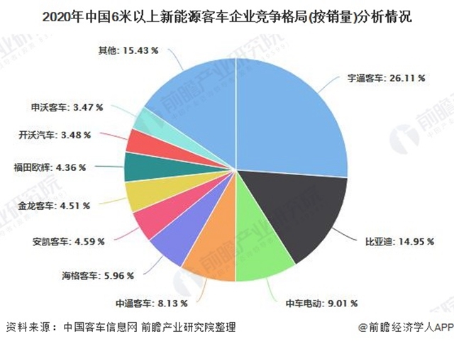 從具體競爭企業(yè)來看,宇通客車占據(jù)市場優(yōu)勢,2020年銷售數(shù)量達到15940輛,市場份額為26.11%,超過排名第二的比亞迪新能源客車銷量的一半,前三家企業(yè)宇通、比亞迪和中通市場份額達到50.07%。