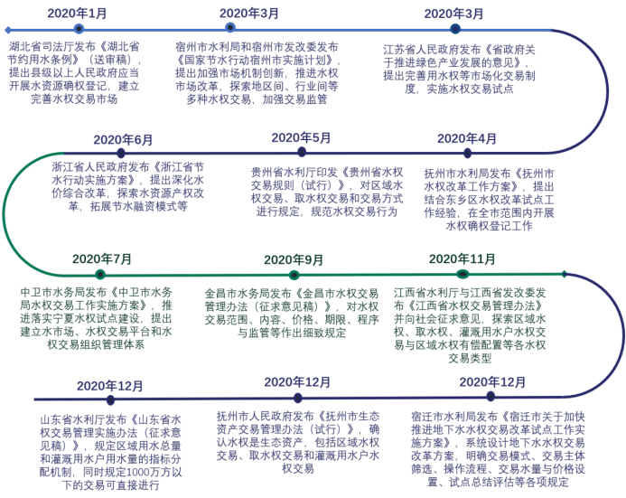 相比2019年,2020年全國地方級政策出臺進度明顯加快,水權(quán)制度設(shè)計進一步優(yōu)化。不僅有多個省著手進行水權(quán)的確權(quán)登記工作,將區(qū)域水權(quán)、取水權(quán)和灌溉用水戶水權(quán)交易納入相關(guān)政策規(guī)定,也有部分省份進行制度創(chuàng)新,如江西省將區(qū)域水權(quán)有償配置納入水權(quán)交易范疇,對部分水權(quán)進行行政區(qū)域內(nèi)的有償分配,進一步提高水資源價值;浙江省進一步提出將探索水價綜合改革、拓展節(jié)水融資模式,拓寬水權(quán)價值實現(xiàn)范疇;宿遷市出臺水權(quán)改革方案,對地下水取水權(quán)交易的各項規(guī)定進行明確規(guī)定,對水權(quán)交易納入新產(chǎn)品提供制度參考。