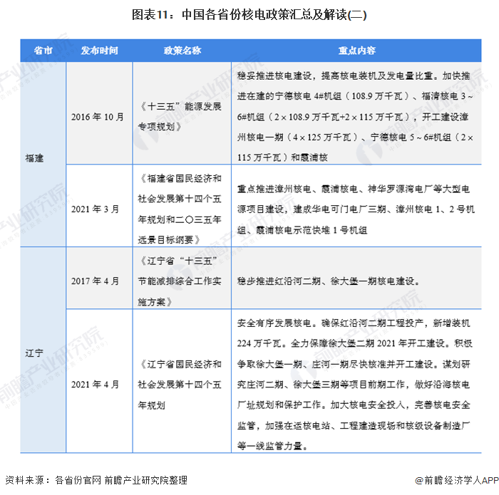 現(xiàn)有或規(guī)劃在建的核電站省份包括:江蘇、浙江、福建、山東、遼寧、廣西、廣東和海南,各省份均在“十三五”、“十四五”時(shí)期發(fā)布了推動(dòng)核電建設(shè)的支持性政策,政策內(nèi)容均落實(shí)了“安全高效發(fā)展核電產(chǎn)業(yè)”的主旨: