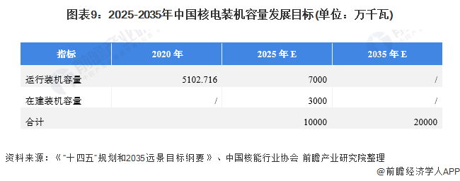 此外,根據(jù)中國(guó)核能行業(yè)協(xié)會(huì)發(fā)布的《中國(guó)核能年度發(fā)展與展望(2020)》中的預(yù)測(cè)數(shù)據(jù)顯示,到2025年,我國(guó)在運(yùn)核電裝機(jī)達(dá)到7000萬(wàn)千瓦,在建3000萬(wàn)千瓦;到2035年,在運(yùn)和在建核電裝機(jī)容量合計(jì)將達(dá)到2億千瓦;核電建設(shè)有望按照每年6至8臺(tái)機(jī)組穩(wěn)步推進(jìn)。