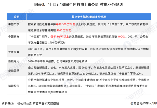 根據(jù)“十四五規(guī)劃和2035年愿景目標(biāo)綱要”,“十四五”期間,我國(guó)核電運(yùn)行裝機(jī)容量達(dá)到7000萬(wàn)千瓦。據(jù)此,核電行業(yè)的中國(guó)廣核、中國(guó)核電也相應(yīng)提出了其十四五發(fā)展目標(biāo),中國(guó)廣核表示將保持每年300萬(wàn)千瓦以上發(fā)展速度,中國(guó)核電表示每年將保持3GW以上的發(fā)展速度。此外,核電企業(yè)的其他上市公司也明確了其核電業(yè)務(wù)的發(fā)展布局: