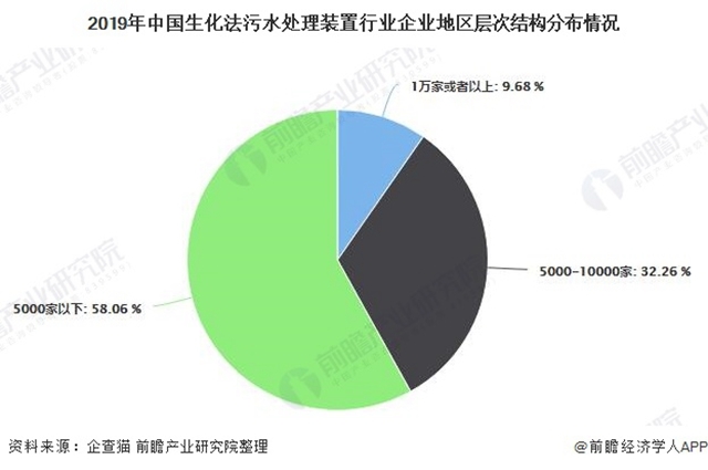 根據(jù)企查貓的數(shù)據(jù)顯示,截止到2019年年底,我國生化法污水處理裝置行業(yè)企業(yè)地區(qū)呈現(xiàn)三個階梯隊伍: