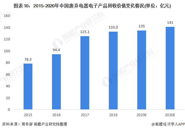 從回收價值看,根據(jù)商務(wù)部數(shù)據(jù),2015-2018年中國廢棄電器電子產(chǎn)品回收價值整體呈增長趨勢,2018年達(dá)133億元。根據(jù)我國廢棄電器電子產(chǎn)品回收數(shù)量與回收重量比率,2019年,我國廢棄電器電子產(chǎn)品回收價值約達(dá)135億元,2020年約達(dá)141億元。