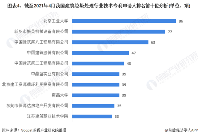 從建筑垃圾處理行業(yè)技術(shù)專利申請人來看,在申請數(shù)量靠前的企業(yè)及單位專利申請數(shù)量均較少。其中,排在前三名的北京工業(yè)大學(xué)、新鄉(xiāng)市振英機(jī)械設(shè)備有限公司、中國建筑第八工程局有限公司的專利申請數(shù)量均在100一下,分別為86項、77項和63項。整體來看,建筑垃圾處理行業(yè)的技術(shù)專利集中度仍處在較低水平,申請單位分散。