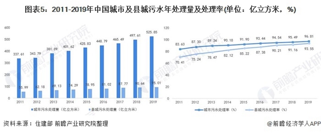 截止2019年底,我國(guó)城市及縣城年污水處理量分別達(dá)到了525.85億立方米和95.01億立方米,污水處理率分別達(dá)到了96.81%和93.55%。城市及縣城污水處理率已經(jīng)提前完成了“十三五”時(shí)期規(guī)劃的污水處理率目標(biāo)(“十三五”規(guī)劃目標(biāo):到2020年底,城市污水處理率目標(biāo)為95%,縣城污水處理率目標(biāo)為85%,東部地區(qū)縣城力爭(zhēng)達(dá)到90%)。