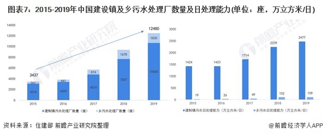 自2015年以來(lái),我國(guó)農(nóng)村污水廠數(shù)量飛速增長(zhǎng),污水處理能力穩(wěn)步提升,建設(shè)鎮(zhèn)及鄉(xiāng)污水處理廠數(shù)量由2015年的3437座增長(zhǎng)至2019年的12480座,增速高達(dá)三倍左右。截止2019年底,我國(guó)建設(shè)鎮(zhèn)及鄉(xiāng)污水日處理能力分別達(dá)到了2477萬(wàn)立方米/日和109萬(wàn)立方米/日。