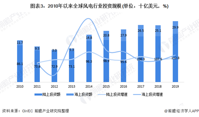 分投資類型來看,2010-2019年,全球風能投資以陸上風電項目為主,但海上風電項目的投資增速較快。2019年,全球陸上風電項目共投資了1128億美元,同比增長5%,海上風電項目共投資了299億美元,同比增長19%。
