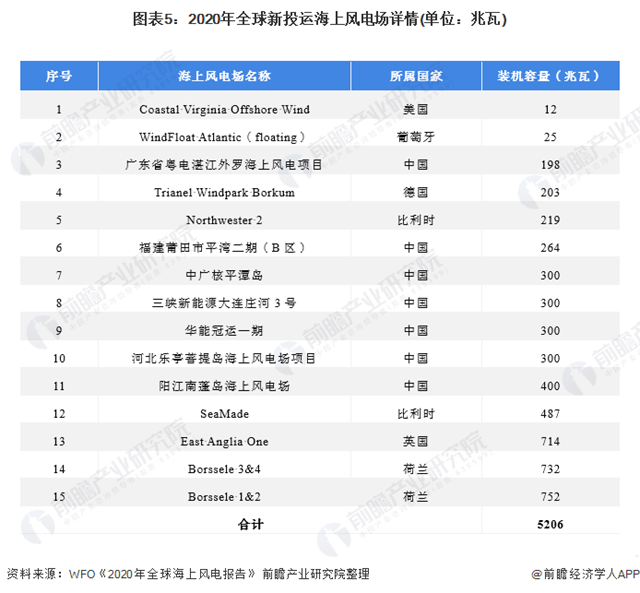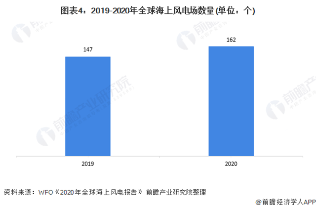 海上風電場方面,據WFO的統(tǒng)計數據顯示,截至2020年末,全球已投運海上風電場共162個,較2019年增加了15個,這15個新建投運的海上風電場分布在中國、英國、德國、葡萄牙、比利時、荷蘭和美國,風場平均容量為347兆瓦。