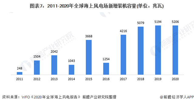 海上風電場方面,2011年以來,全球海上風電場建設加速,裝機容量保持穩(wěn)定增長;2018-2020年之間,全球海上風電場每年的新增裝機容量都保持在5000兆瓦以上;2020年,全球海上風電場新增裝機容量5206兆瓦。