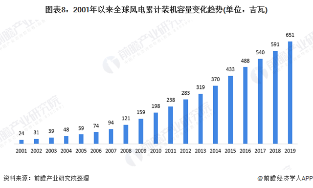 累計裝機容量方面,2001-2019年,全球風電累計裝機容量也不斷增長,至2019年末,已達651吉瓦,因海上風電場累計裝機容量占全球海上總裝機容量的比重達92.4%,若按90%的占比計算,全球風電場累計裝機容量約為585吉瓦。