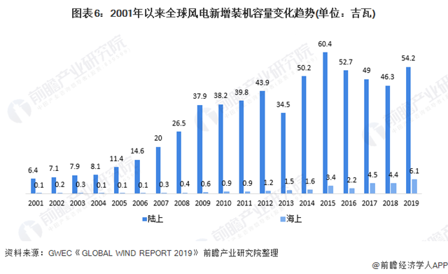 2020年,海上風電場累計裝機容量占全球海上風電總裝機容量的比重達92.4%,從全球風電總裝機容量來看,2001年以來,全球新增風電裝機容量總體增長,2010年以后,陸上新增裝機容量波動增長,而海上風電新增裝機容量保持平穩(wěn)增長。2019年,全球新增風電裝機容量合計達60.4吉瓦,其中陸上新增容量54.2吉瓦,海上新增容量6.1吉瓦。