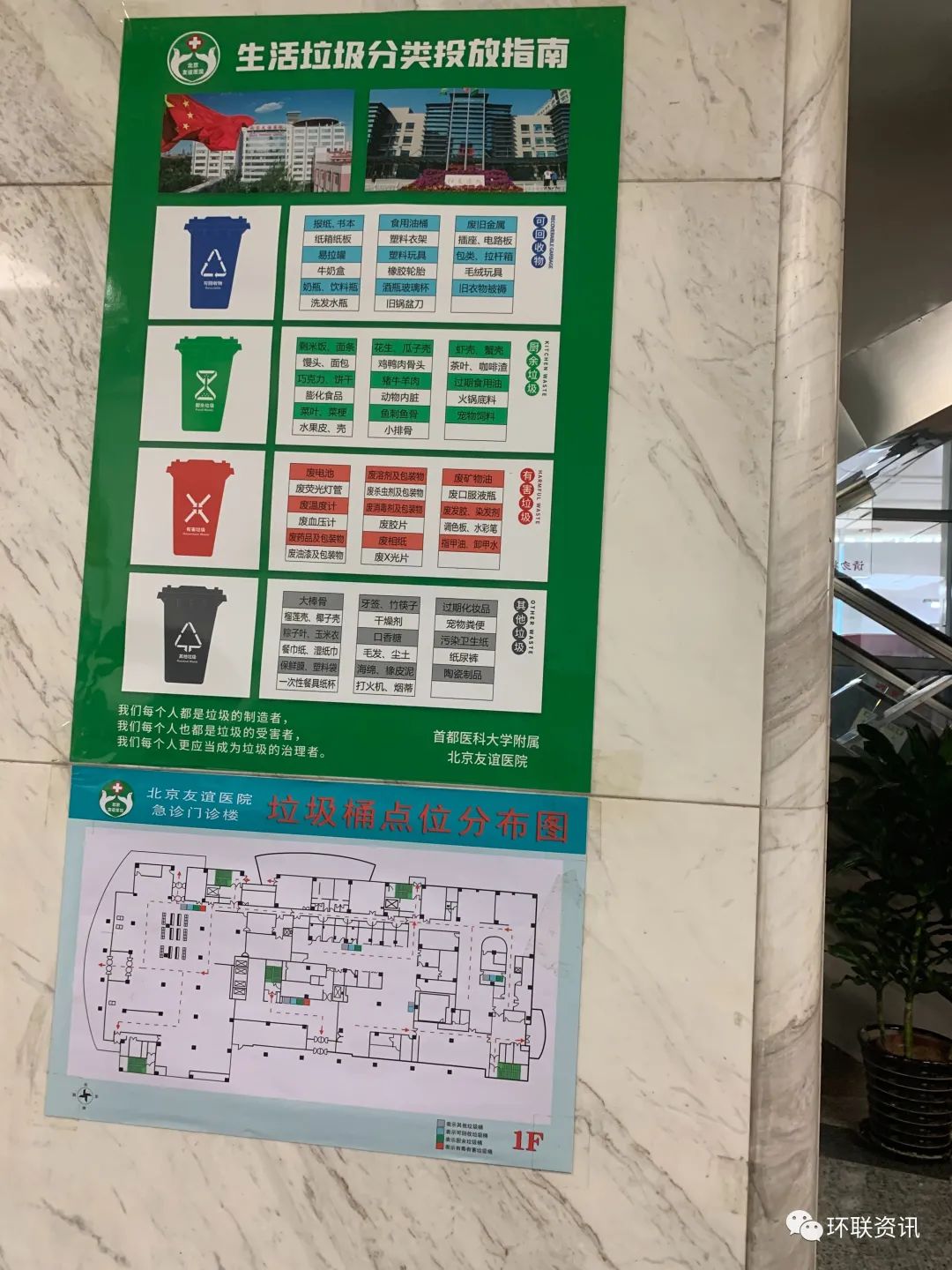 走進(jìn)友誼醫(yī)院西城院區(qū)門診樓,墻壁上張貼的《生活垃圾分類指南》和《垃圾桶點位分布圖》十分顯眼,電子屏幕上則滾動播放著生活垃圾分類的宣傳片。副院長李昕介紹,醫(yī)院共張貼了500多張海報、發(fā)放了20000多份宣傳片來宣傳垃圾分類的內(nèi)容。