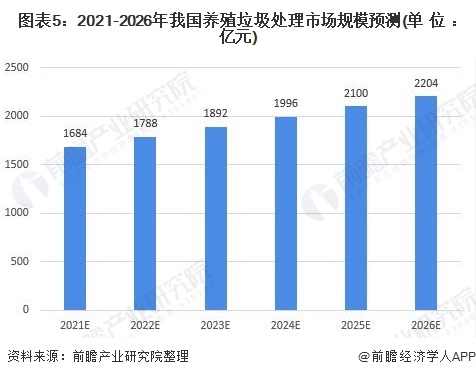 因此按照2026年全國(guó)畜禽糞污綜合利用率達(dá)到95%,2023年達(dá)到85%計(jì)算,前瞻預(yù)計(jì)2023年全國(guó)畜禽糞污治理市場(chǎng)規(guī)模將超過1800億元,2026年則有望達(dá)到2200億元,行業(yè)市場(chǎng)空間巨大。