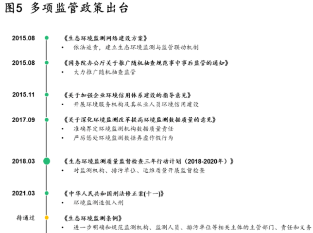 此外,政府對(duì)第三方服務(wù)企業(yè)也將嚴(yán)加監(jiān)管,避免數(shù)據(jù)造假、運(yùn)維不規(guī)范等問(wèn)題。2015年至今,環(huán)境監(jiān)測(cè)質(zhì)量監(jiān)管政策持續(xù)出臺(tái)(如圖5),尤其是在剛通過(guò)不久的刑法修正案中,環(huán)境監(jiān)測(cè)造假入刑,懲治力度大幅提升。2018年展開(kāi)的三年行動(dòng)“打假”也卓有成效,大量違規(guī)機(jī)構(gòu)遭到清退。在國(guó)家層面,生態(tài)環(huán)境部聯(lián)合市場(chǎng)監(jiān)管總局對(duì)37家國(guó)家級(jí)資質(zhì)認(rèn)定生態(tài)環(huán)境監(jiān)測(cè)機(jī)構(gòu)開(kāi)展了“雙隨機(jī)”監(jiān)督檢查,其中有3家被注銷(xiāo)資質(zhì)認(rèn)定證書(shū),1家因出具失實(shí)報(bào)告被責(zé)令整改并處以罰款,18家因存在未嚴(yán)格執(zhí)行標(biāo)準(zhǔn)規(guī)范等問(wèn)題,被責(zé)令限期整改。在地方層面,以河北省為例,對(duì)282家生態(tài)環(huán)境監(jiān)測(cè)機(jī)構(gòu)進(jìn)行專(zhuān)項(xiàng)監(jiān)督檢查,最終暫停、縮減114家機(jī)構(gòu)的監(jiān)測(cè)資質(zhì)及監(jiān)測(cè)項(xiàng)。