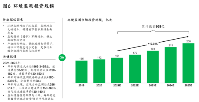 伴隨需求升級(jí),我們預(yù)計(jì)“十四五”期間,環(huán)境監(jiān)測(cè)將迎來(lái)968億元的累計(jì)投資(如圖6),同期環(huán)境監(jiān)測(cè)運(yùn)營(yíng)規(guī)模將保持11%的年復(fù)合增速,在2025年達(dá)到165億。