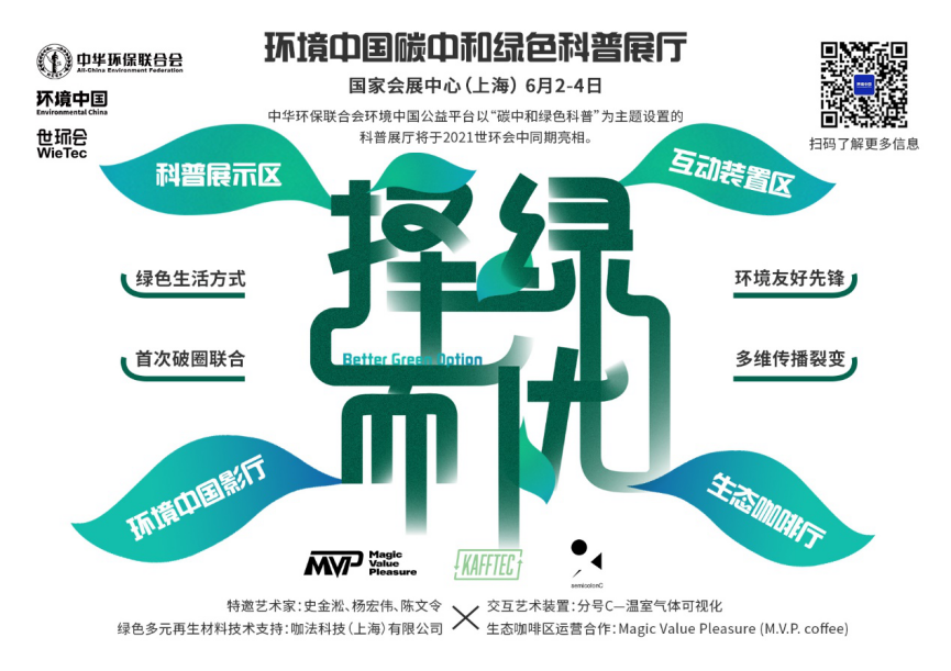 中華環(huán)保聯(lián)合會(huì)環(huán)境中國(guó)公益平臺(tái)以“碳中和綠色科普”為主題設(shè)置的科普展廳將于2021世環(huán)會(huì)中同期亮相,該展廳由科普展示區(qū)、互動(dòng)裝置區(qū)、環(huán)境中國(guó)影廳、生態(tài)咖啡廳組成。將邀請(qǐng)藝術(shù)名家史金淞、楊宏偉等展出為此次展廳特別呈現(xiàn)的作品,也有青年新媒體藝術(shù)團(tuán)隊(duì)“分號(hào)C”首次呈現(xiàn)將二氧化碳排放數(shù)據(jù)可視化的交互藝術(shù)裝置,觀眾們還能從展廳易讀易懂的文字圖表呈現(xiàn)方式中詳盡地感受“碳中和”跟每個(gè)人的密切聯(lián)系,觀察“碳中和”帶來的行業(yè)巨變,理解“碳中和”的內(nèi)涵意義和歷史價(jià)值;生態(tài)咖啡廳將綠色低碳的消費(fèi)方式體現(xiàn)在咖啡廳的一桌一椅,一杯一盞中;搭建也將全面應(yīng)用綠色多元再生材料,共同倡導(dǎo)大眾進(jìn)行“Better Green Option/擇綠而優(yōu)”的綠色生活方式選擇。通過科普展廳的全面展示,參會(huì)觀眾將和“碳中和”重要議題建立聯(lián)系,認(rèn)識(shí)到在嚴(yán)峻的氣候問題面前需要肩負(fù)的責(zé)任,自發(fā)地加入行動(dòng)中。屆時(shí)將會(huì)邀請(qǐng)多位環(huán)境友好引領(lǐng)者和KOL環(huán)境先鋒達(dá)人參展,與多個(gè)不同領(lǐng)域媒體共同進(jìn)行跨界宣傳與破圈。
