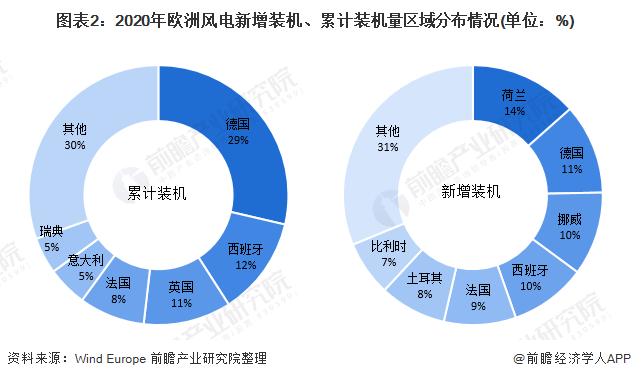 2、2020年德國(guó)風(fēng)電裝機(jī)規(guī)模最大、荷蘭新增裝機(jī)量最多