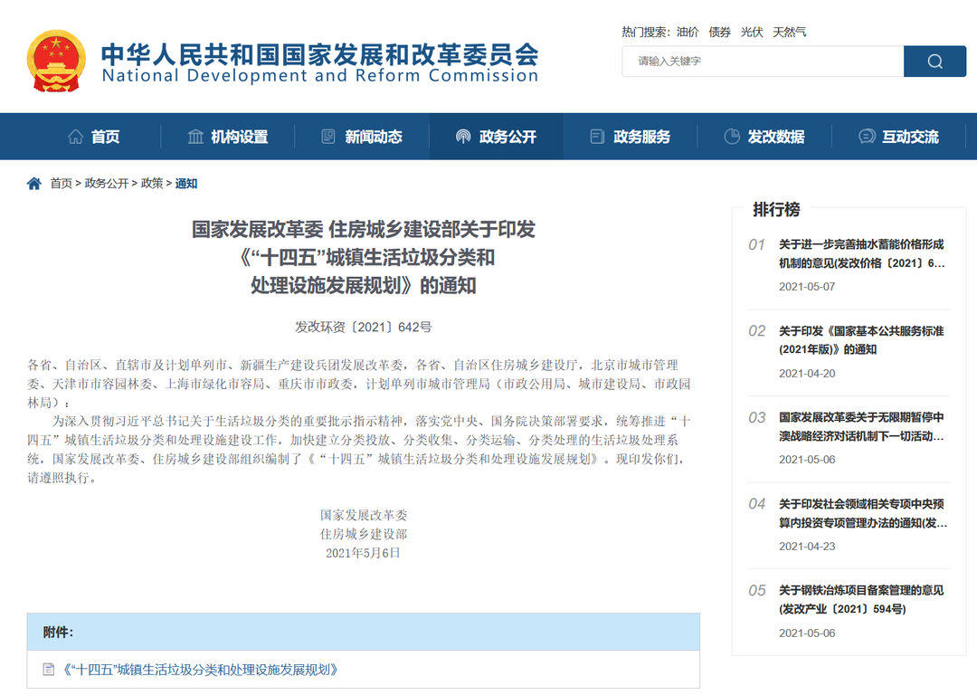 5月6日,國(guó)家發(fā)展改革委、住房城鄉(xiāng)建設(shè)部聯(lián)合下發(fā)關(guān)于印發(fā)《“十四五”城鎮(zhèn)生活垃圾分類和處理設(shè)施發(fā)展規(guī)劃》的通知(發(fā)改環(huán)資〔2021〕642號(hào))。