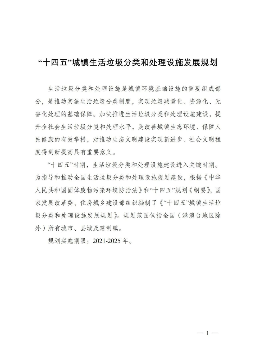 為深入貫徹習(xí)近平總書(shū)記關(guān)于生活垃圾分類的重要批示指示精神,落實(shí)黨中央、國(guó)務(wù)院決策部署要求,統(tǒng)籌推進(jìn)“十四五”城鎮(zhèn)生活垃圾分類和處理設(shè)施建設(shè)工作,加快建立分類投放、分類收集、分類運(yùn)輸、分類處理的生活垃圾處理系統(tǒng),國(guó)家發(fā)展改革委、住房城鄉(xiāng)建設(shè)部組織編制了《“十四五”城鎮(zhèn)生活垃圾分類和處理設(shè)施發(fā)展規(guī)劃》。現(xiàn)印發(fā)你們,請(qǐng)遵照?qǐng)?zhí)行。