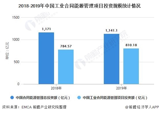 據(jù)中國節(jié)能協(xié)會(huì)節(jié)能服務(wù)產(chǎn)業(yè)委員會(huì)(EMCA)公布的數(shù)據(jù)顯示,2018年和2019年中國合同能源管理總投資額分別為1171億元和1141.1億元,工業(yè)項(xiàng)目投資額在2018和2019年分別占67%和71%。