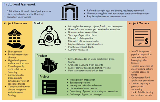這些挑戰(zhàn)可被劃分為六個大類,其中包括制度框架的缺陷、項目投資者不足以滿足長期投資需求、缺少高效的市場連接機(jī)制、產(chǎn)品開發(fā)人員缺乏知識儲備、項目研發(fā)能力和資金儲備差、項目所有者能力與預(yù)期水平存在差距等。